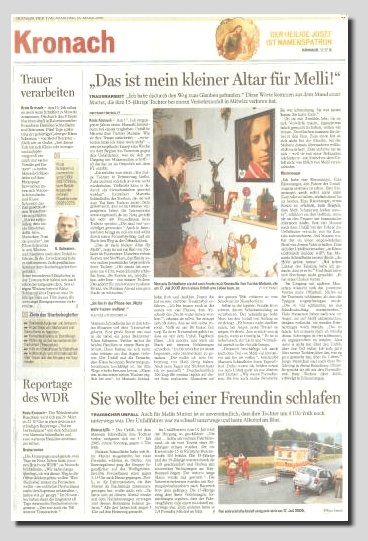 Gegen 7.30Uhr stand ich auf und kochte Kaffee, Stefan saß am PC, er war schon sehr früh wach und konnte auch die Hubschrauber heute Morgen hören. Er dachte sich noch, was da wohl passiert sei und wollte eigentlich dorthin fahren, es war ja nicht weit weg von zu Hause. Doch er tat es dann doch nicht. Er war noch sehr müde, weil er die Nacht nicht gut schlafen konnte und legte sich, nachdem ich aufgestanden war, wieder hin. Ich trank meinen Kaffee und wollte mich danach auch noch einen Moment ausruhen, doch war ich an diesen Morgen sehr unruhig und konnte nicht mehr schlafen. Ich setzte mich also an meinen PC und bereitete einige Auktionen vor. Um halb zehn dachte ich an Melli und daran, das sie ja keinen Schlüssel dabei hat. Deshalb duschte ich mich schell um, um 10Uhr fertig zu sein, wenn Melli heim kommt. Es wurde 10Uhr und ich wartete auf Melli. Gegen halb elf klingelte es an der Tür und ich glaubte Melli kommt heim, doch es war Sandra , sie fragte ob Melli zu Hause wäre, ich antwortete das sie gleich heimkomme. Immerzu schaute ich auf die Uhr und machte mir Sorgen wo Melli bleibt.. ..es war sehr ungewöhnlich, dass sie unpünktlich war. Es wurde elf Uhr und meine Angst wurde immer größer, ich versuchte mehrmals sie auf dem Handy zu erreichen, doch es war ausgeschaltet. Dann stand Stefan wieder auf und ich erzählte ihn von meinen Ängsten, er meinte, dass ja gestern das Fest war und die Mädels bestimmt länger schlafen. Zunächst gab ich mich damit etwas zufrieden, kannte ich ja von Melli das sie gerne etwas länger schläft. Doch es dauerte nicht lange und die Angst wurde in mir immer heftiger, ich entschloss mich zur Jelena zu fahren, um Melli abzuholen. Nur 10min später war ich schon dort und Jelenas großer Bruder sagte, dass Melli nicht da ist, fast gleichzeitig kam Jelenas Mutter dazu und bestätigte mir auch das Melli nicht dort übernachtet hatte. Ich fing an zu zittern und mein Blutdruck schoss in die Höhe, sofort wollte ich mit Jelena selbst reden, doch ihre Mama wollte mich erst gar nicht rein lassen, ich ließ aber nicht locker. Jelena lag noch im Bett, ich wollte wissen, wo Melli ist und wie lange sie auf dem Fest waren, wann sie nach Hause sind und mit wem Melli zuletzt zusammen war, doch Jelena wusste rein gar nichts, überhaupt nichts !!! Ich ging völlig verwirrt und voller Angst zurück zum Auto und fuhr wieder heim. Ich hatte tief im Inneren die Gewissheit, dass irgendetwas passiert sein muss, ich hatte die unheimliche Vorstellung das Melli vergewaltigt wurde und irgendwo verletzt liegt, allein. Zu Hause angekommen und völlig fertig erzählte ich Stefan davon, er wollte aber immer noch nicht daran glauben, das was passiert sein soll, so rief ich meine Mutter an. Oma war auch total fertig und meinte, dass ich sofort die Polizei anrufen soll .Ich zögerte noch und rief erst bei Lena und Tina an. Lena hörte nicht, aber Tina und Tina erzählte, dass Melli doch bei Jelena geschlafen hätte. Ich war völlig am Ende, unter schweren Schock lief ich in der Wohnung auf und ab, immer wieder schaute ich am Fenster um möglicht bald, den erlösenden Blick, Melli zu sehen erhaschen zu können. Dann fuhr Olli mit dem Auto vor und nur eine Minute später klingelte er an unserer Tür. Völlig fertig und am Türpfosten lehnend, fragte er mich: „ Wie geht es denn eurer Melli ?“ Dann brach er zusammen. Ich schrie laut auf und wollte alles wissen und sagte dass wir schon lange auf Melli warten und wo ist denn Melli, was ist passiert ???!!!. Olli stotterte „ Wir hatten einen Autounfall, ein Auto hat uns von hinten überfahren und Melli lag bewegungslos auf der Strasse.“ Nur Sekunden später rief ich die Polizei, es dauerte für mich eine lange Minute, bevor jemand abnahm und ich schrie ins Telefon, das ich Melli vermisse und Olli grad vom Unfall erzählte. Der Polizist sagte zu mir: „ Ja , es gab heute Nacht einen schweren Verkehrsunfall, wir schicken jemanden vorbei.“ Ich wusste sofort, dass es sehr sehr schlimm um Melli steht und hoffte und betete immer, immer wieder, dass nicht das schlimmste passiert sein möge. Ich schrie nur noch und sank unter heftigen Schmerzen mehrmals zu Boden. Olli saß mit Stefan im Wohnzimmer und ich schrie immer wieder zu Stefan: „Was ist wenn Melli tot ist, bitte lieber Gott NEIN, was ist wenn unsre Melli tot ist !!! „ Olli sagte nichts, er stand genau wie ich, unter schwerem Schock, Stefan versuchte mich mehrmals zu beruhigen und sagte immer wieder, das ich nicht an das schlimmste denken soll, doch ich fühlte es, ich wusste es. Ich hab dann sofort wieder meine Mutter angerufen, doch ich schrie nur, brachte auch keinen Satz mehr zusammen, ich schrie nur „ Komm schnell rüber, es ist was mit Melli passiert“ Sie hatte gar nichts richtig am Telefon verstanden und rief Sani meine Schwester an, Sani rief dann noch mal bei mir an, was denn los sei. Wieder schrie ich ins Telefon, das Melli einen Unfall hatte und sie mit Mama ganz schnell kommen soll. Sani machte sich gleich auf dem Weg, noch völlig unwissend. Es dauerte für mich eine Ewigkeit bis die Polizei vorfuhr, es waren 2 oder 3 Wagen, dann klingelte es und 2 Polizisten und noch ein Mann kamen hoch, erst später erkannte ich, das dieser Mann ein Seelsorger, ein Pfarrer war. Ich schrie und wollte wissen was mit meiner Melli passiert sei „Was ist mit meiner Melli, …was ist mit meiner Melli?“ aber der Polizist fragte mich erst, ob ich einen Henri kenne, Ich sagte „Nein, ich kenne keinen Henri“ , dann erzählte er weiter, das auch ein Mädchen schwerst verletzt wurde und sie nicht wissen, wer dieses Mädchen ist. Ich sollte eine Beschreibung ihrer Kleidung ab geben, ..ich sagte Melli hat ne Stretchjeans an mit vielen Taschen drauf und weiße Skaterschuhe...der Polizist nickte stumm und mit gesenkten Kopf sagte er leise und tief bedrückt zu mir „ Das Mädchen ist heut morgen verstorben“ Ich brach schreiend zusammen, im Inneren habe ich schon das schlimmste gef